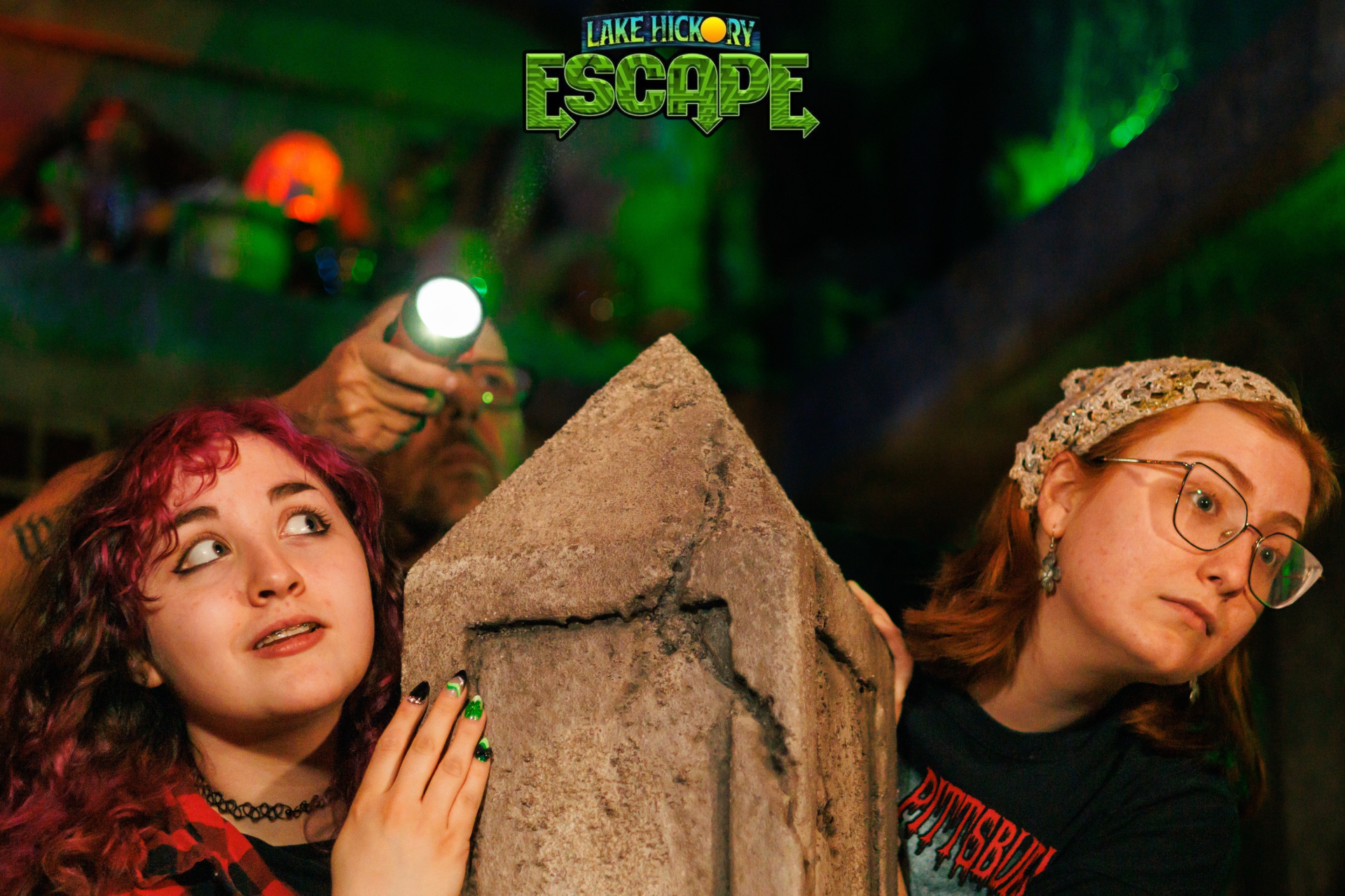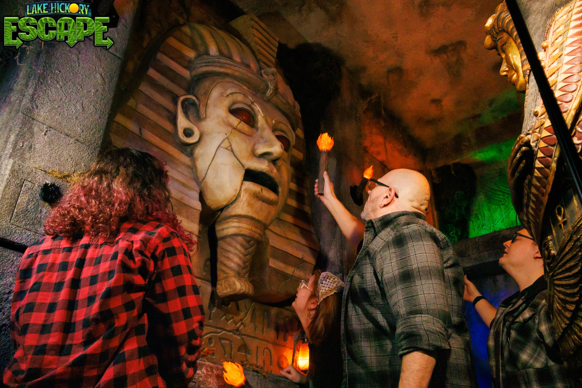 You are part of an archaeological excavation of a CURSED Egyptian tomb. Traps have stripped your fate. Doors have closed and you’ll run out of air in an hour (or a terrifying 10 minutes during haunt season at Lake Hickory Haunts). Egyptian head pieces, real sand, lighting, pneumatics, and other special FX and props work together in order to create an extravagantly detailed environment like no other. This escape adventure features not only one but three rooms! The Curse of the Mummy escape room & puzzle adventure creates an immersive experience that feels like you’re right in the middle of a movie!